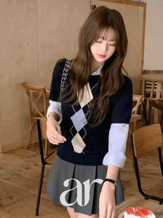 (軽く着られる春ニット/クラシック) ソフトウール ラウンドネック アーガイル 半袖ニット